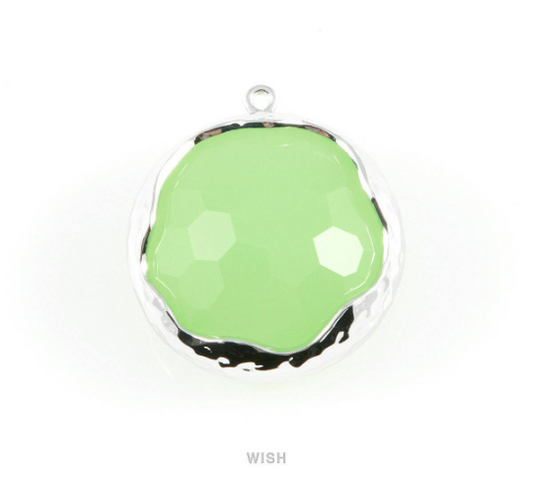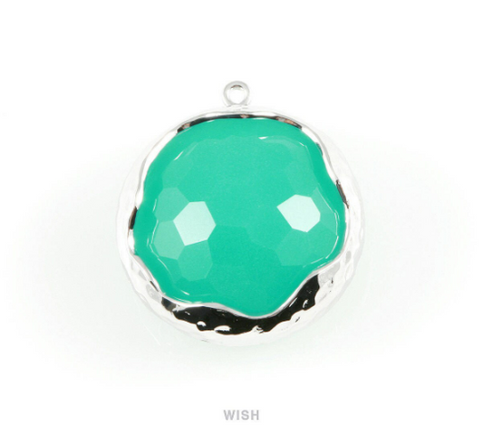1 piece of Mint Faceted Glass Charms in Rhodium, Framed Round Pendant / GMTRH-011-P