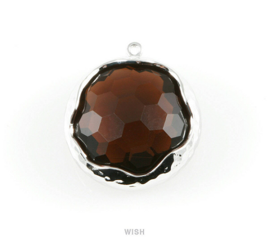1 piece of Smoky Quartz Faceted Glass Charms in Rhodium, Framed Round Pendant/ GSQRH-011-P
