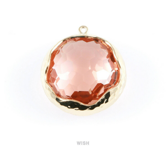 1 piece of Peach Faceted Glass Charms in Gold, Framed Round Pendant/ GPCG-011-P