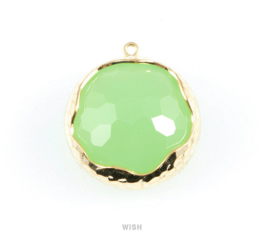 1 piece of Light Mint Faceted Glass Charms in Gold, Framed Round Pendant / GLMG-011-P