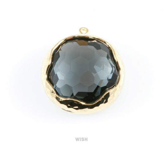 1 piece of Charcoal Faceted Glass Charms in Gold, Framed Round Pendant/ GCCG-011-P