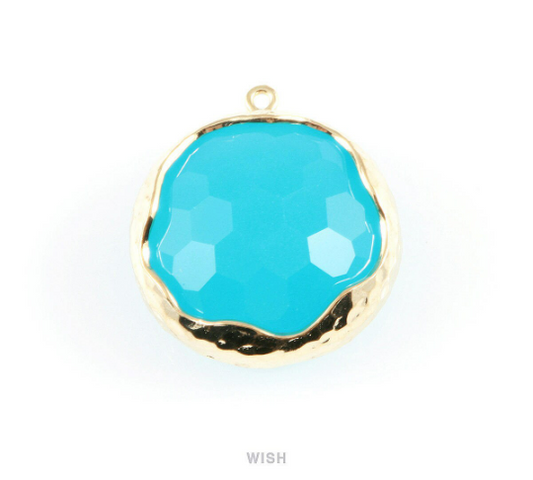 1 piece of Ocean Blue Faceted Glass Charms in Gold, Framed Round Pendant / GOBG-011-P