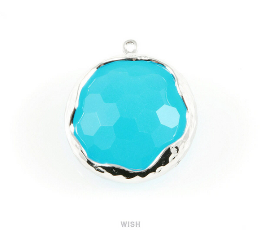 1 piece of Ocean Blue Faceted Glass Charms in Rhodium, Framed Round Pendant/ GOBRH-011-P