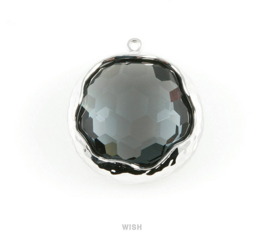 1 piece of Charcoal Faceted Glass Charms in Rhodium, Framed Round Pendant / GCCRH-011-P