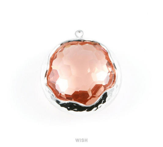 1 piece of Peach Faceted Glass Charms in Rhodium, Framed Round Pendant/ GPCRH-011-P