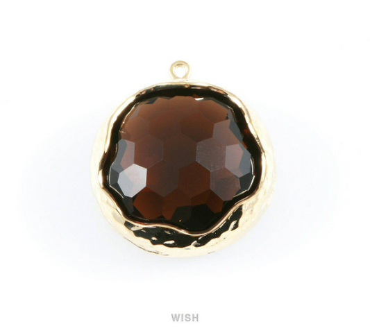 1 piece of Smoky Quartz Faceted Glass Charms in Gold, Framed Round Pendant / GSQG-011-P