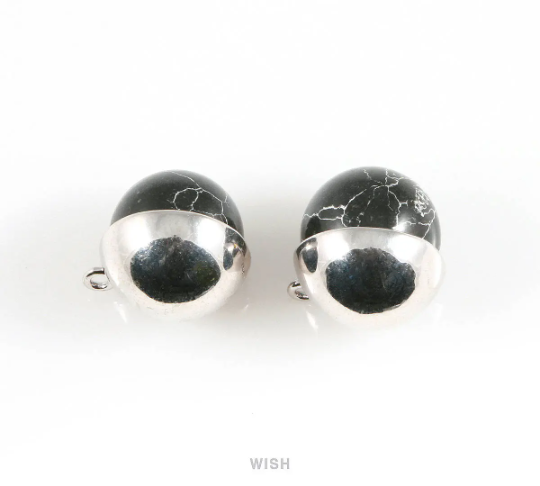 Black Marble Ball Stone Charm in Gold, Gemstone Framed Pendant / SBMG-046-P