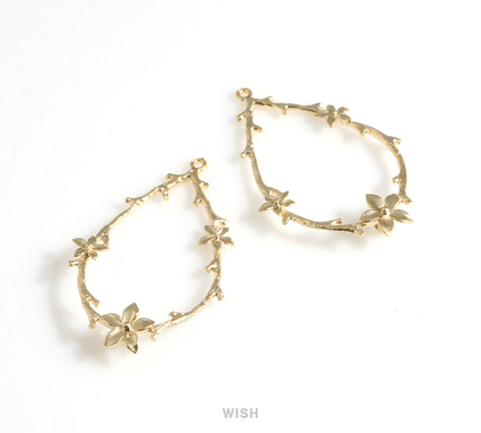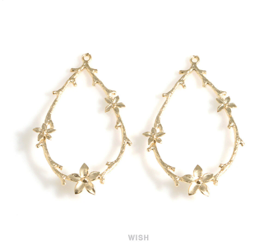 Flower Branch Teardrop Pendant in Matte Gold, Flower on Drop Twig Charm / MMG-641-P