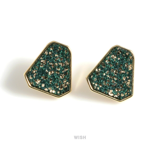 Six Angles Dark Green Fabric Drop with Gold Leaf Stud Earrings in Gold, Six Angles Drop Studs /MDGG-516-E